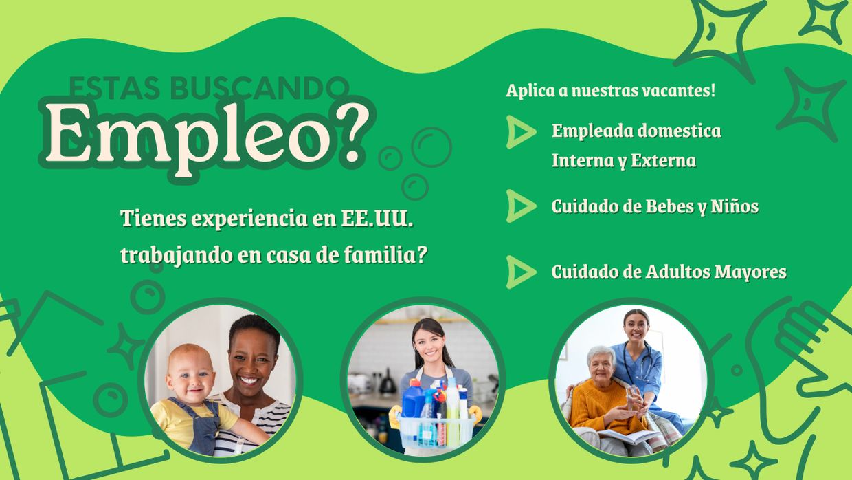 Contáctenos hoy para aprender mas sobre nuestras vacantes de niñera, limpieza del hogar y cuidado de adultos mayores. Ofrecemos precios competitivos y horarios flexibles para satisfacer sus necesidades.
